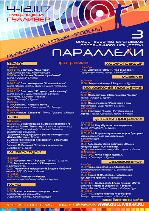 Страница находится в разработке Международный фестиваль современного искусства «ПАРАЛЛЕЛИ» Международный фестиваль современного искусства «ПАРАЛЛЕЛИ» направлен на развитие и популяризацию современного искусства в регионе, взаимодействие различных видов искусств в едином художественном пространстве, поддержку актуальных и экспериментальных направлений в искусстве. Фестиваль предоставляет возможность для реализации проектов в области театра, музыки, литературы, хореографии, кино, изобразительного искусства.
